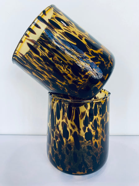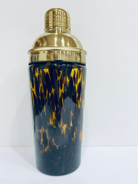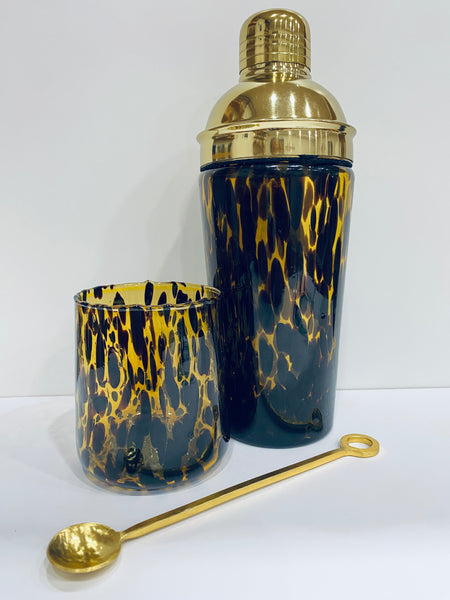A tortoise glass cocktail shaker brings a touch of old-school glamour to the modern bar cart. Its mottled amber and espresso tones feel equal parts retro and refined.