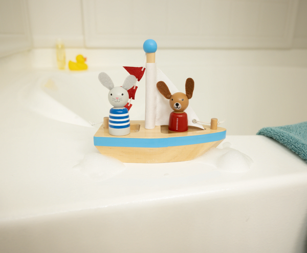 A beautiful wooden bath toy that really floats and is great for bath time fun. The little dog and bunny characters float as well, or are happy to hop in their cute little boat and bob away while your little one gets clean.