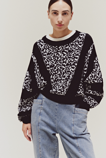 This dolman sleeve sweater blends comfort with visual impact. Rendered in black and white, its abstract tiger-like pattern creates a dynamic, almost hand-painted effect. The relaxed fit and sculptural sleeves make it an easy standout for everyday wear.